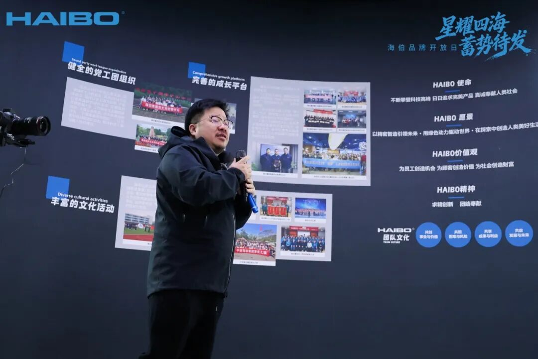 随后,海伯集团董事长兼总裁贺少杰先生登台致辞。他分享了海伯的发展历程与初心使命。重点阐释了“每一位都是追星者”的核心理念,他表示,这一理念承载着海伯人对技术高峰的执着攀登、对绿色未来的责任担当,更凝聚着每一位海伯人对美好生活的朴素追求。他提到,父亲贺定芳创业之初便立下“在每个领域做到世界一流、中国第一”的目标,这份匠心精神已融入企业血脉,而展厅的落成正是对这份坚守与传承的集中呈现,未来将以展厅为载体,深化与各界的交流合作,持续以创新驱动高质量发展。